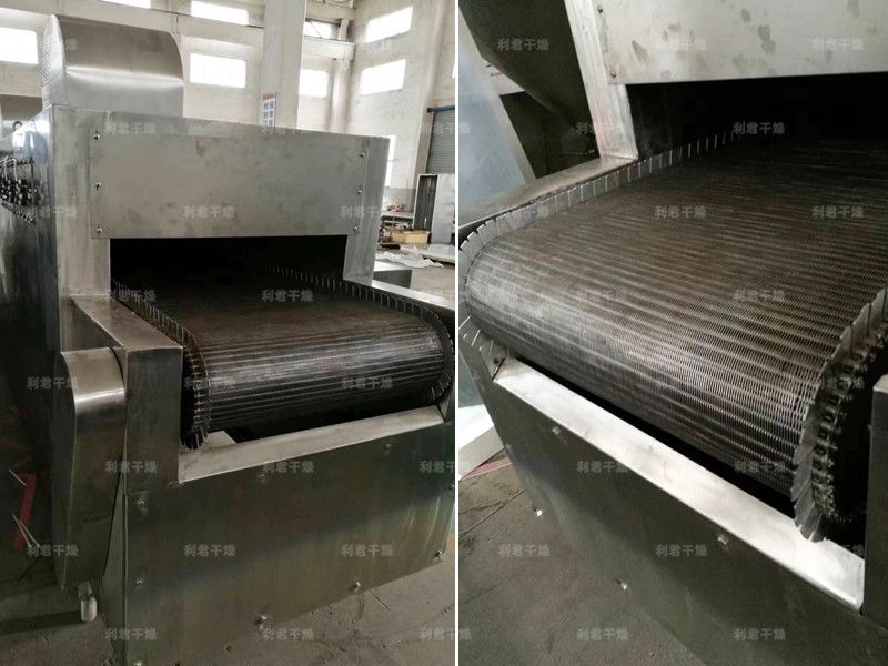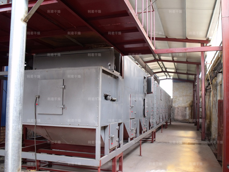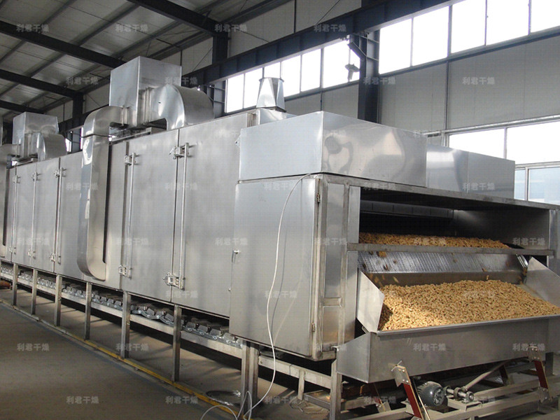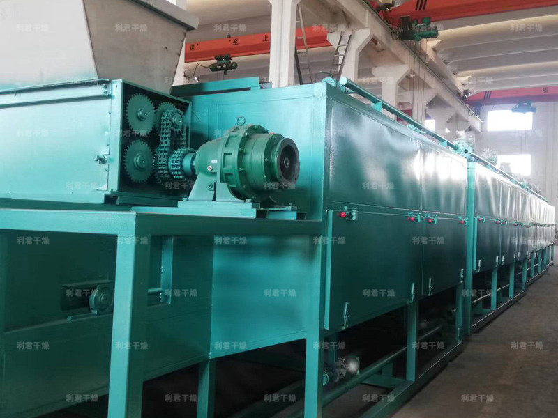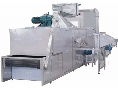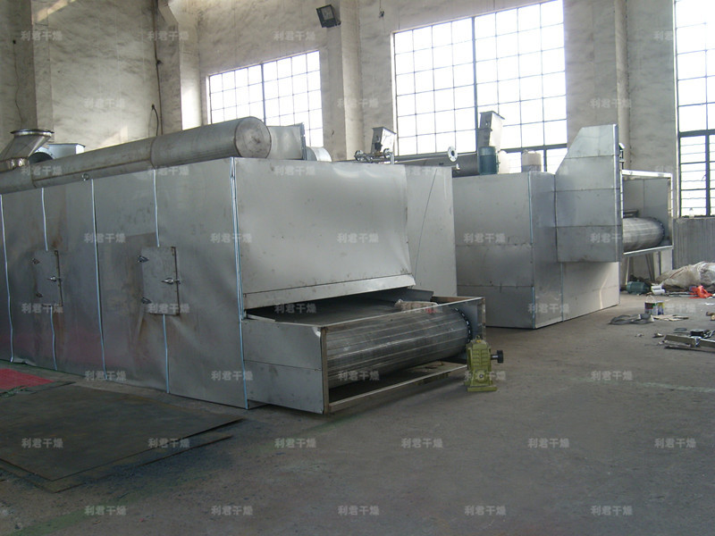 物料由加料器均勻地鋪在網(wǎng)帶上,網(wǎng)帶一般采用12-60目不銹鋼絲網(wǎng),由傳動(dòng)裝置拖動(dòng)在干燥機(jī)內(nèi)移動(dòng)。干燥機(jī)由若干單元組成,每一單元熱風(fēng)獨(dú)立循環(huán),部分尾氣由專門排濕風(fēng)機(jī)排出,廢氣由調(diào)節(jié)閥控制,熱氣由下往上或由上往下穿過(guò)鋪滿物料的網(wǎng)帶完成熱量與質(zhì)量傳遞的進(jìn)程,帶走物料水份。網(wǎng)帶緩慢移動(dòng),運(yùn)行速度可根據(jù)物料溫度自由調(diào)節(jié),干燥后的成品連續(xù)落入收料器中。上下循環(huán)單元根據(jù)用戶需要可靈活配備,單元數(shù)量亦可根據(jù)需要選取。
