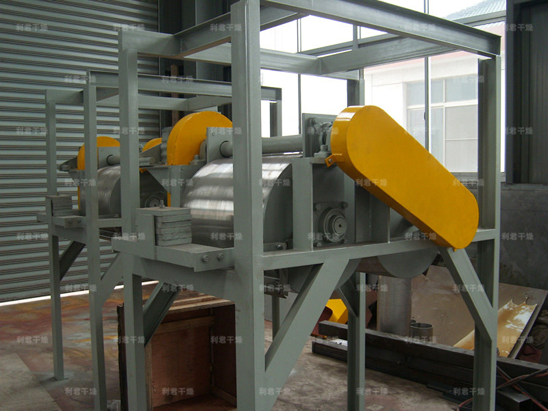 啟動(dòng)電機(jī),主滾筒動(dòng)運(yùn)轉(zhuǎn)平穩(wěn),溫度升高后加入物料后調(diào)整電機(jī)轉(zhuǎn)速及物料在滾筒上薄膜均勻程度來(lái)控制物料最終含水量。