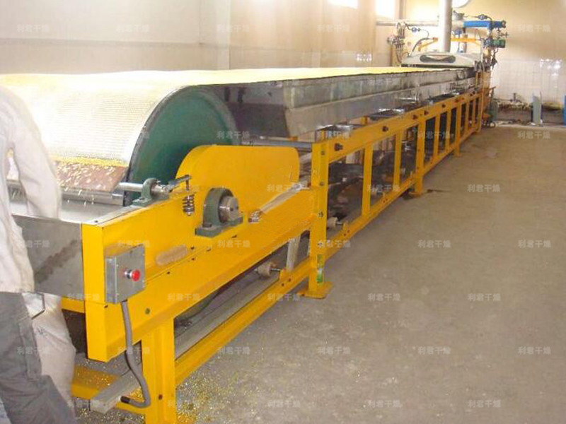 RL型造粒機是利用物料的熔點低于250℃的特性,根據(jù)物料熔融態(tài)時的粘度范圍,通過特殊的布料裝置將熔融液均勻在其下方勻速移動的鋼帶上,在鋼帶下方設置的連續(xù)噴淋裝置的冷卻作用下,使物料在輸送、移運過程中得到冷卻、固化、包裝,從而達到造粒成型的目的。